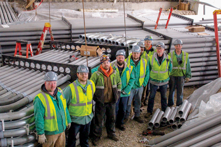 ![]() IBEW members working for Herbst Electric on the massive duct-bank runs for the new mill at Charter Steel in Ohio. From left: Adam Paisley, job superintendent Mike Mandrea, Anthony Scafaria, Chase Lessett, Matt Wetter, John Babuscak, foreman Dave Grabowski and Dennis Elbert. |