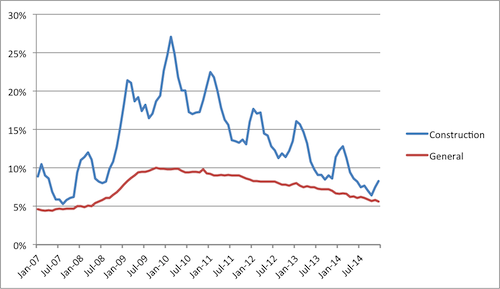 Construction unemployment last year was at its lowest level in nearly seven years. At 8.9 percent, 2014 was the first time annual construction unemployment was below 10 percent since 2007, according to data collected by the Bureau of Labor Statistics.